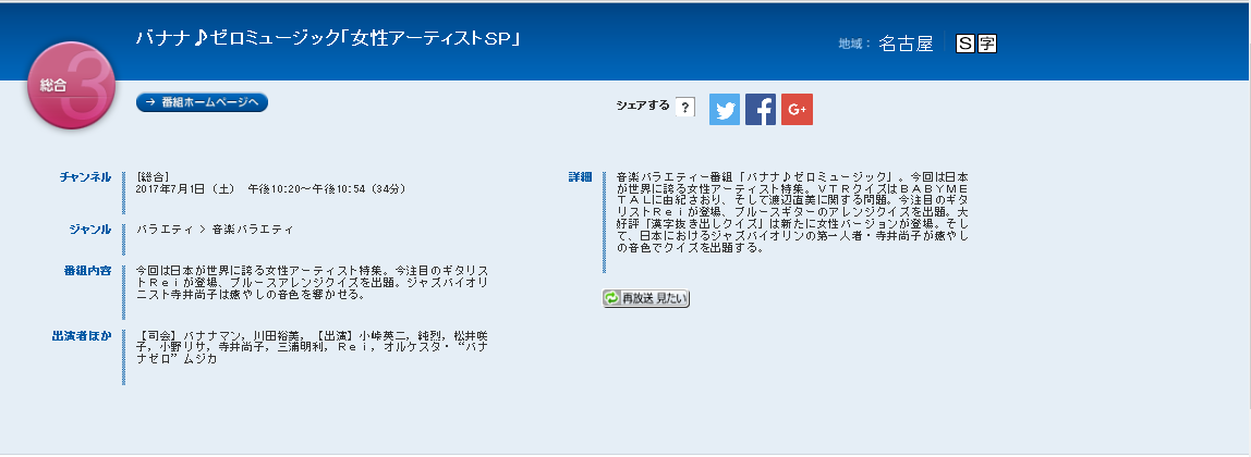音楽バラエティー番組「バナナ♪ゼロミュージック」。今回は日本が世界に誇る女性アーティスト特集。VTRクイズはBABYMETALに由紀さおり、そして渡辺直美に関する問題。今注目のギタリストReiが登場、ブルースギターのアレンジクイズを出題。大好評「漢字抜き出しクイズ」は新たに女性バージョンが登場。そして、日本におけるジャズバイオリンの第一人者・寺井尚子が癒やしの音色でクイズを出題する。https://bh.pid.nhk.or.jp/pidh07/ProgramIntro/Show.do?pkey=300-20170701-21-05363&cid=nnc_m_03000002