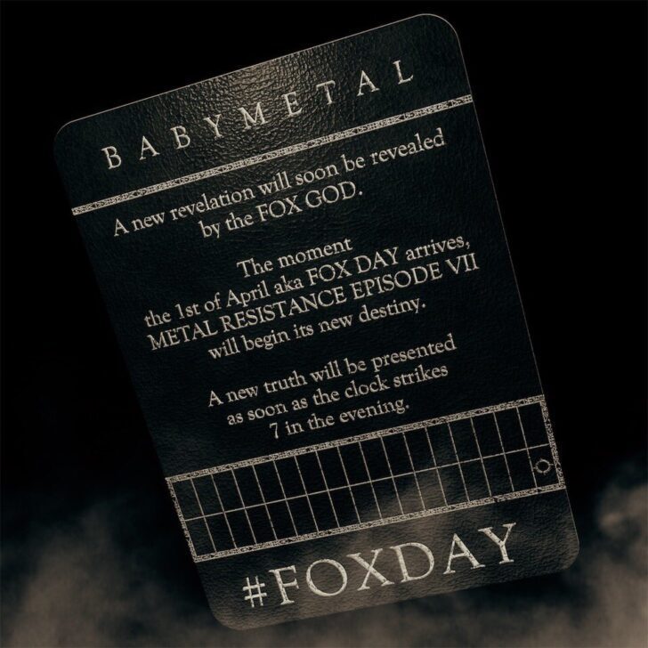 新たなお告げの全貌は、7の刻に明らかになるだろう。#FOXDAY #BABYMETAL pic.twitter.com/NjcW1GvWrd— BABYMETAL (@BABYMETAL_JAPAN) 2018年3月31日