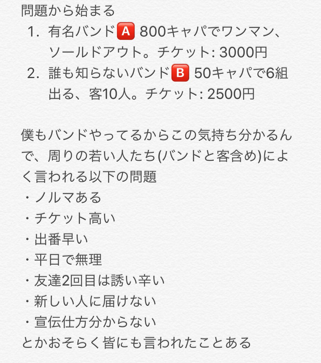 私もバンドやってた頃、直面した問題でした。ノルマ、出番、人を呼ぶ、宣伝方法…当時はネットなんてなかったから宣伝が一番の問題でした。