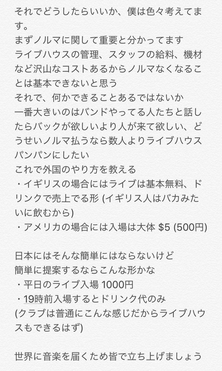 海外のライブハウスのようにオープンではない空間で、新規のお客さん(特に若い世代)が入りにくい、そして都内ではライブハウスが多過ぎて飽和状態という、色々な悪循環が多くとても問題だと思って居ます。— ryo@STFLII (@ryo_gt_17) 2018年6月13日