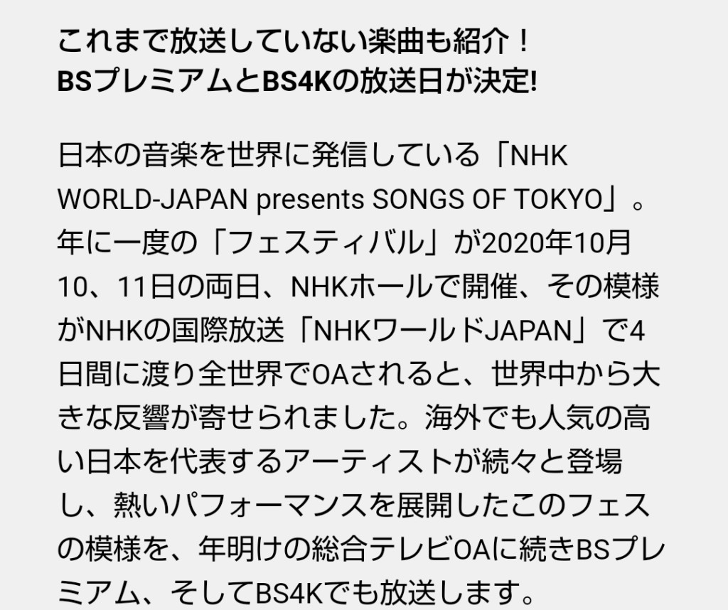 NHK WORLD-JAPAN presents「SONGS OF TOKYO Festival 2020」BSプレミアムとBS4Kの放送日が決定🔥