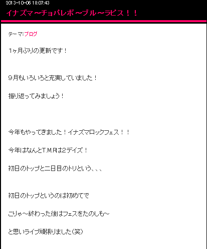 BABYMETALがイナズマ出た時のイナズマ2013の時のIKUOさんのブログを懐かしく思いながら読み返してる…(笑)IKUOさん自分で自分のこと褒めてる(笑) pic.twitter.com/ZtOcJ94NOB