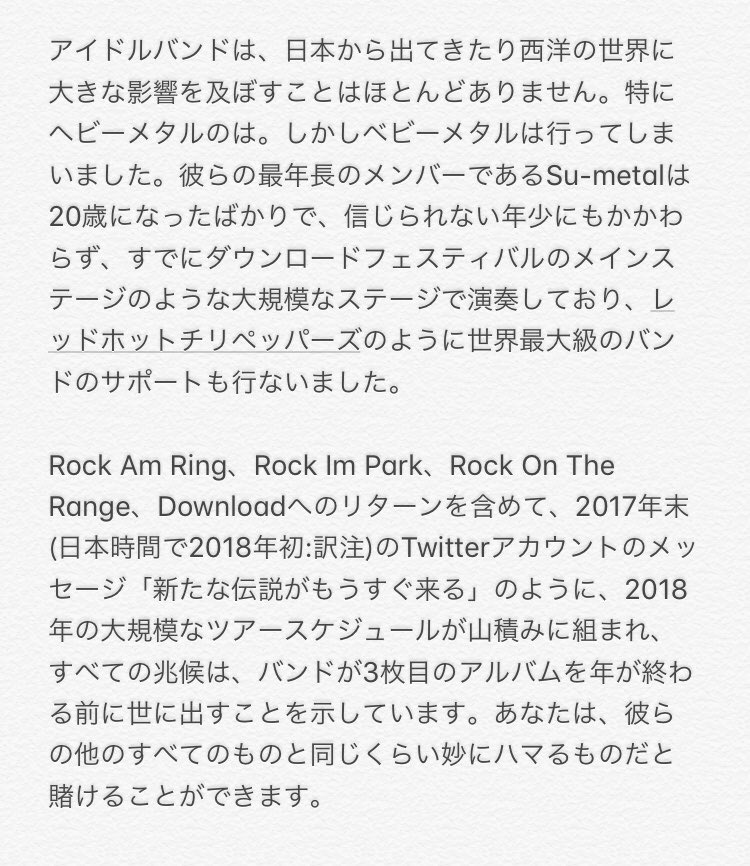 BABYMETAL ニューアルバム2018年にリリース記事とりあえず仮訳しました。誤訳ありかもですがご容赦を。https://t.co/vWpZ2KeSkR pic.twitter.com/F3KkKMjwPW— しーゆー (@seeyou_metal) 2018年1月3日