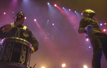 ライブがスタートすると、兜を身につけ杖を操るパフォーマンスの「IN THE NAME OF」、そして「Distortion」と新曲を立て続けに披露。