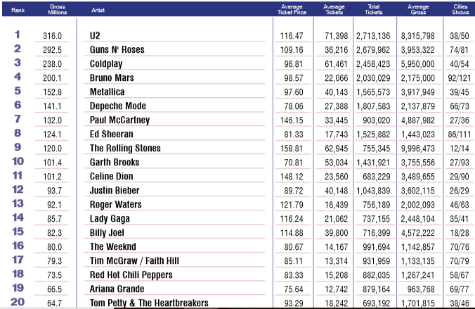 U2、ガンズ、メタリカ、コールドプレイ、ローリングストーンズが上位ってw
