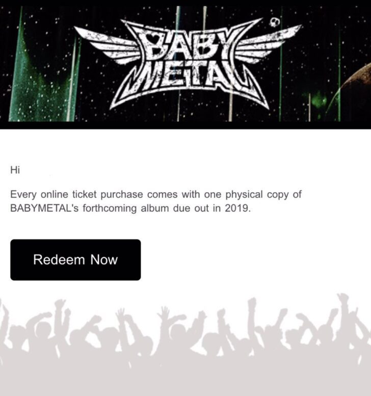 昨日買った10-11の #BABYMETAL のチケットに今年中に発売されるアルバムがCDもついてくるだって⁉︎ さっそく Redeem 押して住所入れたら、追加料金なしで CD2枚送ってくるって!めっちゃ楽しみだけど、いつ頃来るかなぁ? pic.twitter.com/EeaSBM6EQY