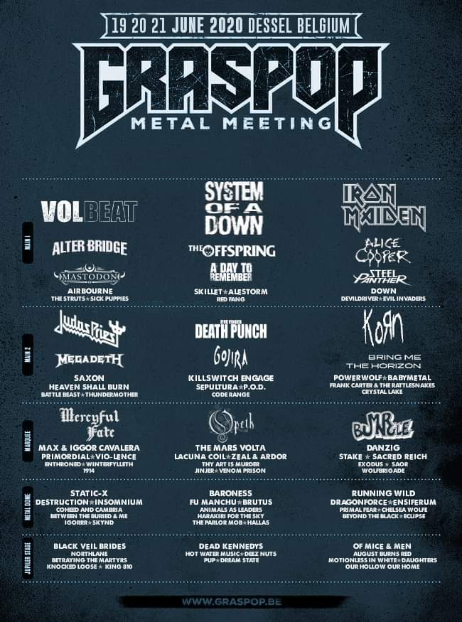 Graspop 2020 : System Of A Down, Iron Maiden, Volbeat, Bring Me The Horizon, KoRn, BabyMetal… https://t.co/rdMKzCp1tT