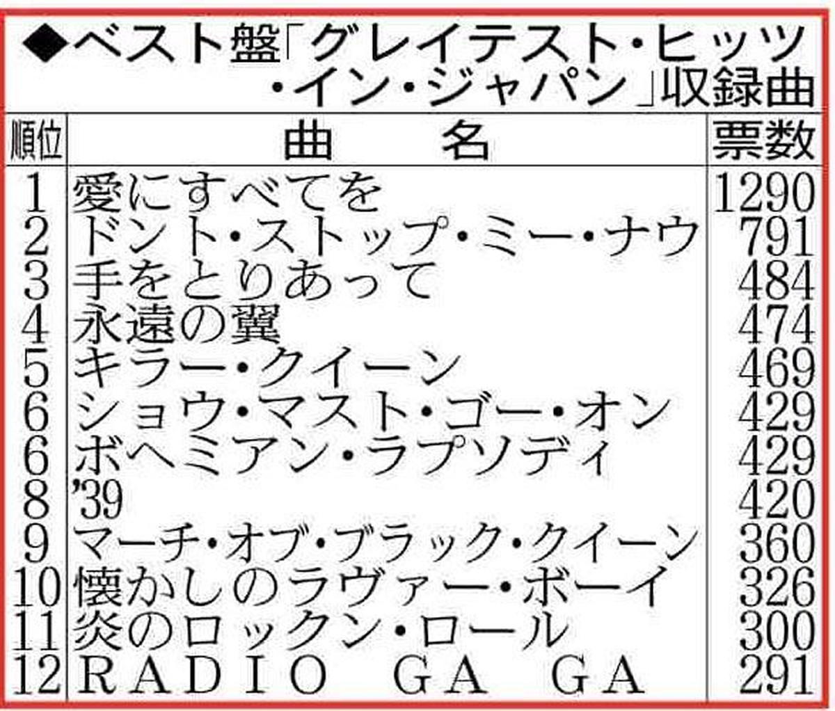 英の伝説的ロックバンド「クイーン」の日本のファン投票によるベストアルバム「グレイテスト・ヒッツ・イン・ジャパン」(15日発売)の収録曲12曲が6日、発表された。