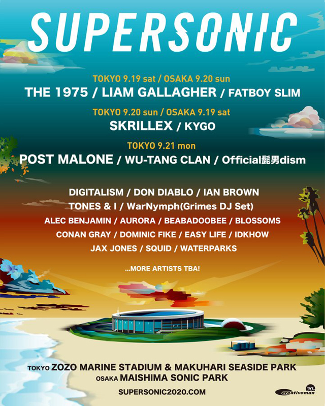 2020年限定のスペシャルフェス<SUPERSONIC>。第1弾アーティスト発表。THE 1975、SKRILLEX、POST MALONE(TOKYOのみ)がヘッドライナーに決定。さらに、LIAM GALLAGHER、FATBOY SLIM、KYGO、WU-TANG CLAN、Official髭男dismなど24組が決定しています。