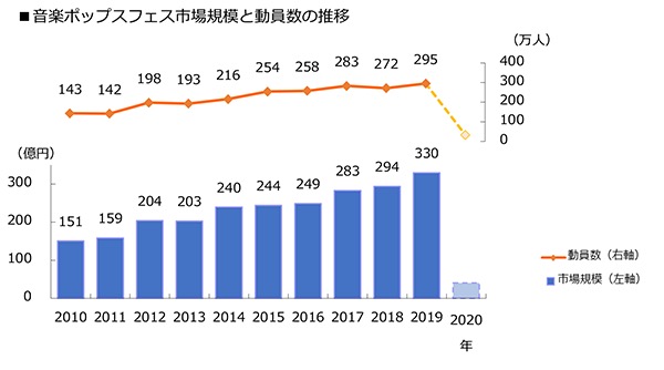 2019年1月から12月に開催された音楽フェスのチケット販売額を推計し、市場規模を算出した。調査結果によると、2019年の音楽ポップスフェス市場規模は、前年比12.1%増の330億円へと拡大。