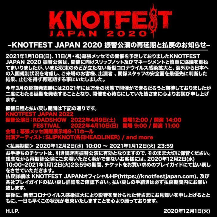 KNOTFEST JAPAN 2020 振替公演の再延期と払戻のお知らせhttps://t.co/7EAQ9JLt3r pic.twitter.com/Ib3CX5HtsC