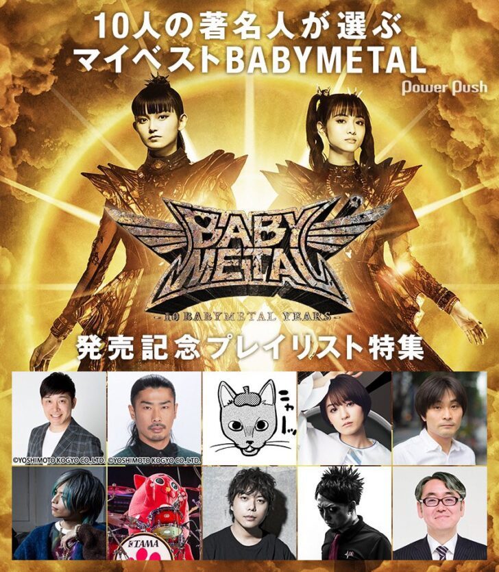 https://natalie.mu/music/pp/babymetal06結成10周年を迎えたBABYMETALが、初のベストアルバム「10 BABYMETAL YEARS」を12月23日にリリースした。 これを記念して音楽ナタリーでは、BABYMETAL好きの著名人にBABYMETAL楽曲に限定したプレイリスト作成を依頼。あべこうじ、パンサーの菅良太郎、マンガ家の斉木久美子、TEAM SHACHIの咲良菜緒、音楽ジャーナリストの柴那典、Fear, and Loathing in Las VegasのSo、ドラマーとしても知られる青森県黒石市出身のゆるキャラ・にゃんごすたー、凛として時雨のピエール中野、SiMのMAH、タワーレコード代表取締役社長の嶺脇育夫氏から到着したBABYMETAL楽曲縛りのプレイリストと、10周年を迎えたBABYMETALへのメッセージを掲載する。