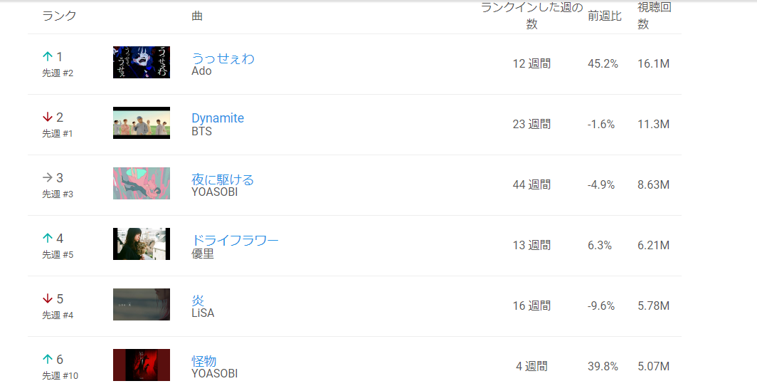 YouTube music charts: Japan 楽曲ランキング
