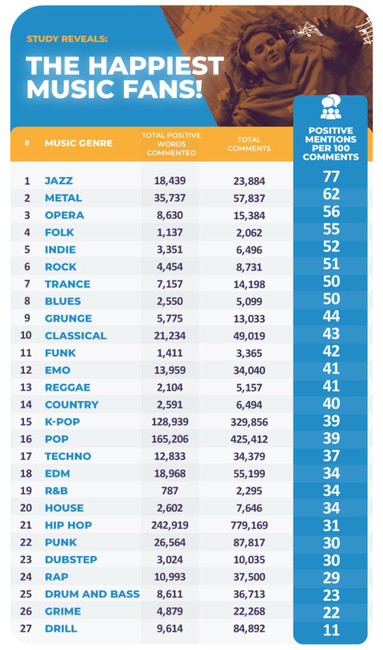 オンラインマーケットプレイスのOnBuy.comは、米ソーシャルニュースサイト/掲示板Redditにある、27の異なる音楽ジャンルのサブレディット(コミュニティ/スレッド)に投稿された200万件以上のコメントを分析。サブレディット内でポジティブな言葉が何回使われたかを計算して、ファンの幸福度を調べたところ、ジャズ・リスナーが最もポジティブで、次いでメタル・ファンが続いています。最もネガティブなのは、ドリル、グライム、ドラムンベースのファンでした。