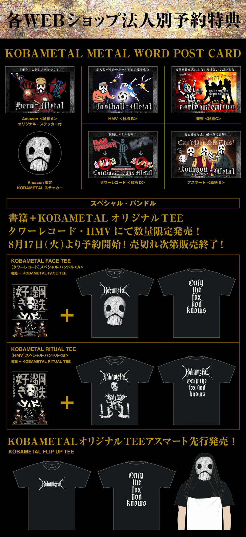 この本は、日本国内のほとんどの店舗・書店で販売されますが、A!Smartでしか手に入らないスペシャルTシャツや、HMVとタワーレコードで販売されるデザインの異なるスペシャルバンドル(本+Tシャツ)も用意されています。さらに、タワーレコード渋谷店(東京)では9月30日、梅田店(大阪)では10月3日に、KOBAMETALとのイベントが開催され、予約特典もあります。