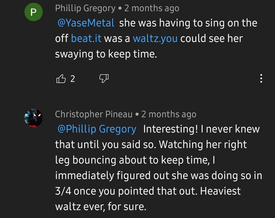 11:18あたりです。彼はタイミングの変化を捉えて、それについて少し話しています。私は音楽に詳しくありませんが、Suが台の上でワルツを踊っているのに気づきました。それがこの曲にゴシックホラーのような雰囲気を与えていると思います。純粋な音楽として、この曲は私のお気に入りです。
