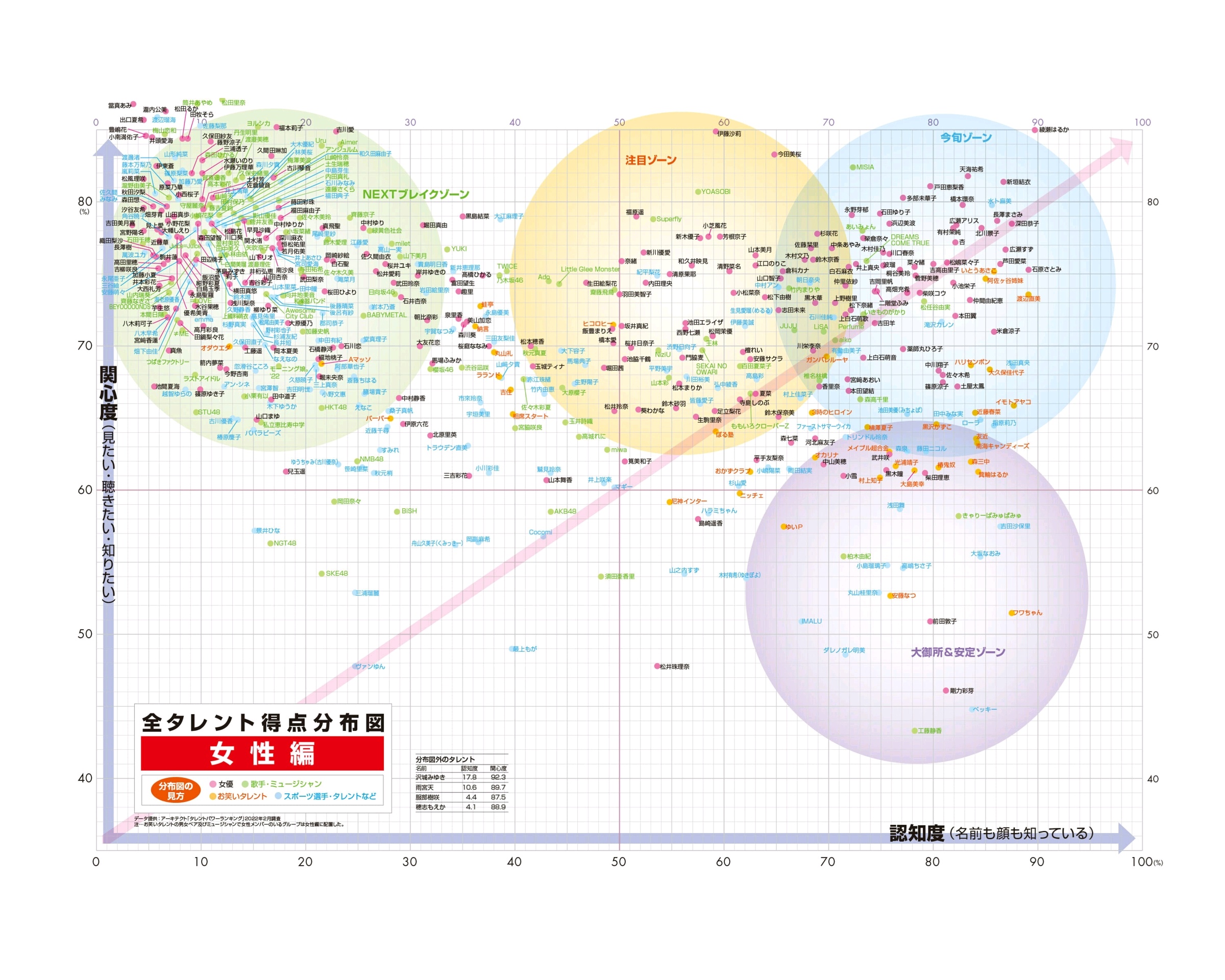 Babymetal [25.5, 72] (x: Recognition , y: Interest of those recognize them) 三吉彩花 Miyoshi Ayaka [35.5, 61], 松井愛莉 Matsui Airi [27, 75], Perfume [73, 71.5], LiSA [69.5, 71], 乃木坂 Nogizaka46 [38.5, 75], モーニング娘。Morning Musume [17.5, 68.5], 和楽器バンド Wagakki band [19.5, 73]