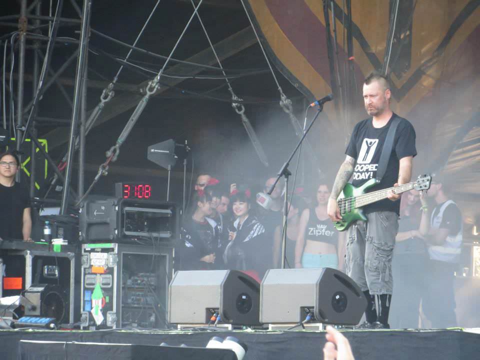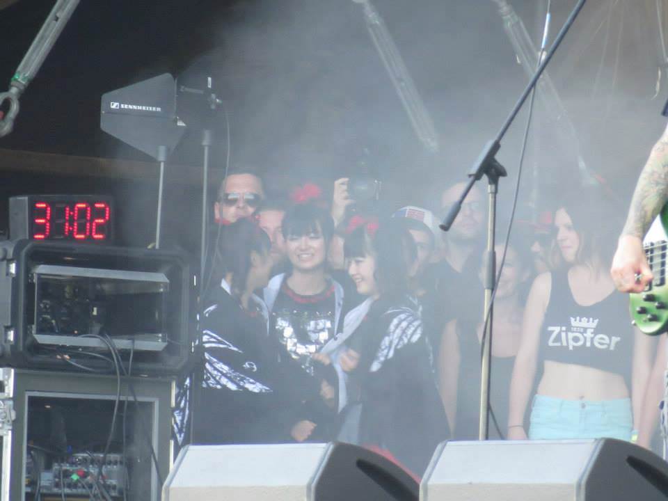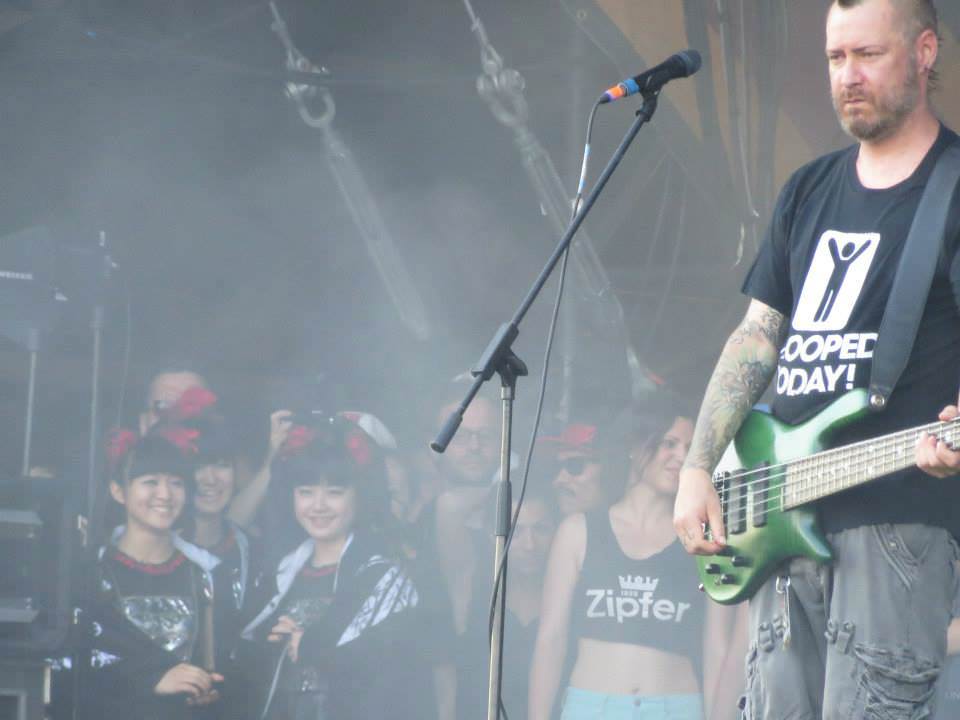 BABYMETALはサイドステージで見ていたようです。3分20秒と4分40秒の映像では、ベースの左側に黒と銀のトップスと赤いヘアアクセサリーが見えます。