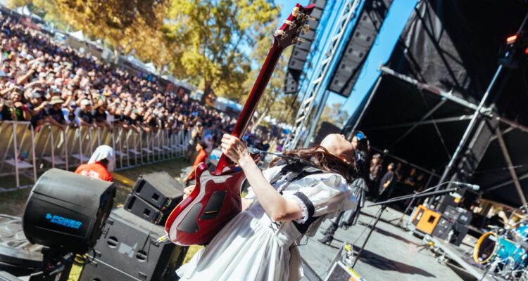 アフターショック・フェスティバルのクアーズ・ライト・ステージに明るい太陽が照りつける中、BAND-MAIDが小さな観客を集めて登場しました。10月9日、暑いカリフォルニア州サクラメントで、予定より早く、東京出身の女性だけのロック・ユニットがサウンドチェックを始めた。このユニークな5人組は、自分たちの演奏を「お給仕」と呼んで、バーチャルなロックンロールカフェの客にサービスしている。どんなサービスをしてくれるのか、熱心なファンも、そうでない人も気になるところだ。蒸し暑い昼下がりに、おしゃれなメイド服で登場した彼女たち。そして、3年ぶりにアメリカに帰ってきた彼らの要求に応えて、チューンナップやピックアップが行われた。