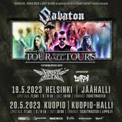 スウェーデンのメタルヒーロー、SabatonのTour To End All Toursのイギリスとヨーロッパ公演のスペシャルゲストが発表されました。日本のダンス・メタル・センセーションであるBABYMETALは、3年以上ぶりの海外公演となり、特別ゲストとして出演する。フィンランドのユーロビジョンで優勝したLordiが全公演のオープニングを務めます。