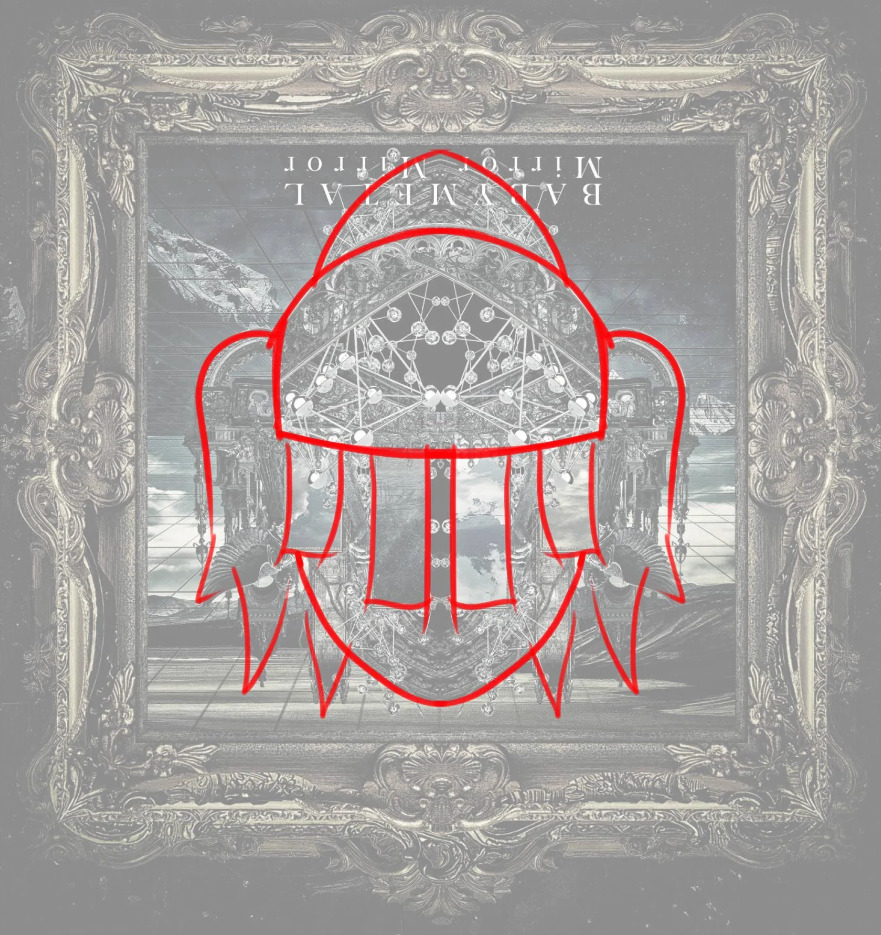 最初の画像では、全体の形が頭になっています。横にある2つの短いスロットは耳で、垂れ下がっている天使はイヤリングになっている…。幾何学的な形はヘッドピースで、後ろの暗い部分は髪、そこから下がっている部分はフィンジ/前髪です。逆さになった2つの塔はツインテールになっており、アーチはテールのトップかヘアタイになっています。