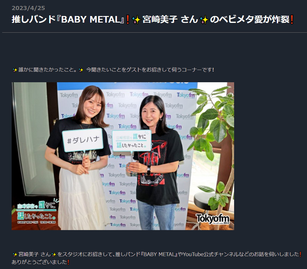 その中でバンド好きであることも紹介された宮崎。「BABYMETAL」の大ファンで、この日のラジオにも2日にぴあアリーナMMで行われたライブTシャツを着てきたという。2日のライブはすでに今年2回目だといい、「チケットがなかなか手に入らない感じで…抽選に応募してたの。当たったんですよ〜!それで1人で出かけました」とうれしそうに話した。