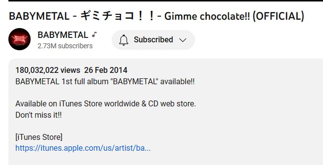 https://www.reddit.com/r/BABYMETAL/comments/15cqgkf/gimme_choco_180m_youtube_views/