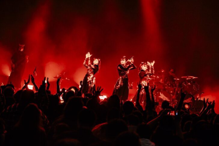 現地のオーディエンスから温かい歓声があがると、海外での最初のブレイクのきっかけとなった「ギミチョコ!!」が続き、更に熱気を帯びた。続く「PA PA YA!! (feat. F,HERO)」では、激しくタオルを回すシーンも見受けられ、「Distortion (feat. Alissa White-Gluz)」「BxMxC」で、観客はBABYMETALのパフォーマンスの深淵へと誘われた。
