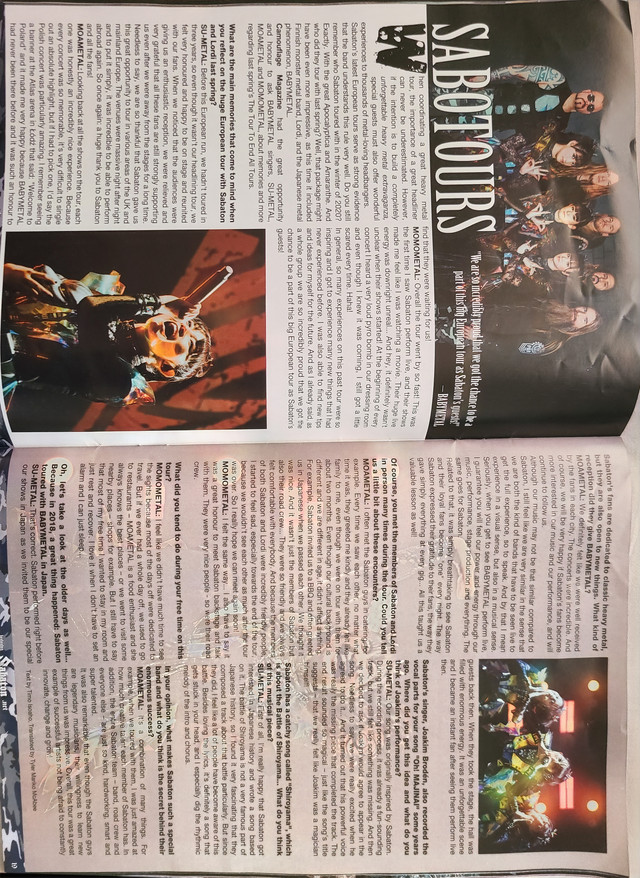 まだここに投稿されていないかもしれないけど、最近Sabatonのグッズを注文したら、彼らの雑誌に今年初めのツアーでのBABYMETALのインタビューが載っていたんだ。写真を貼っておくよ。