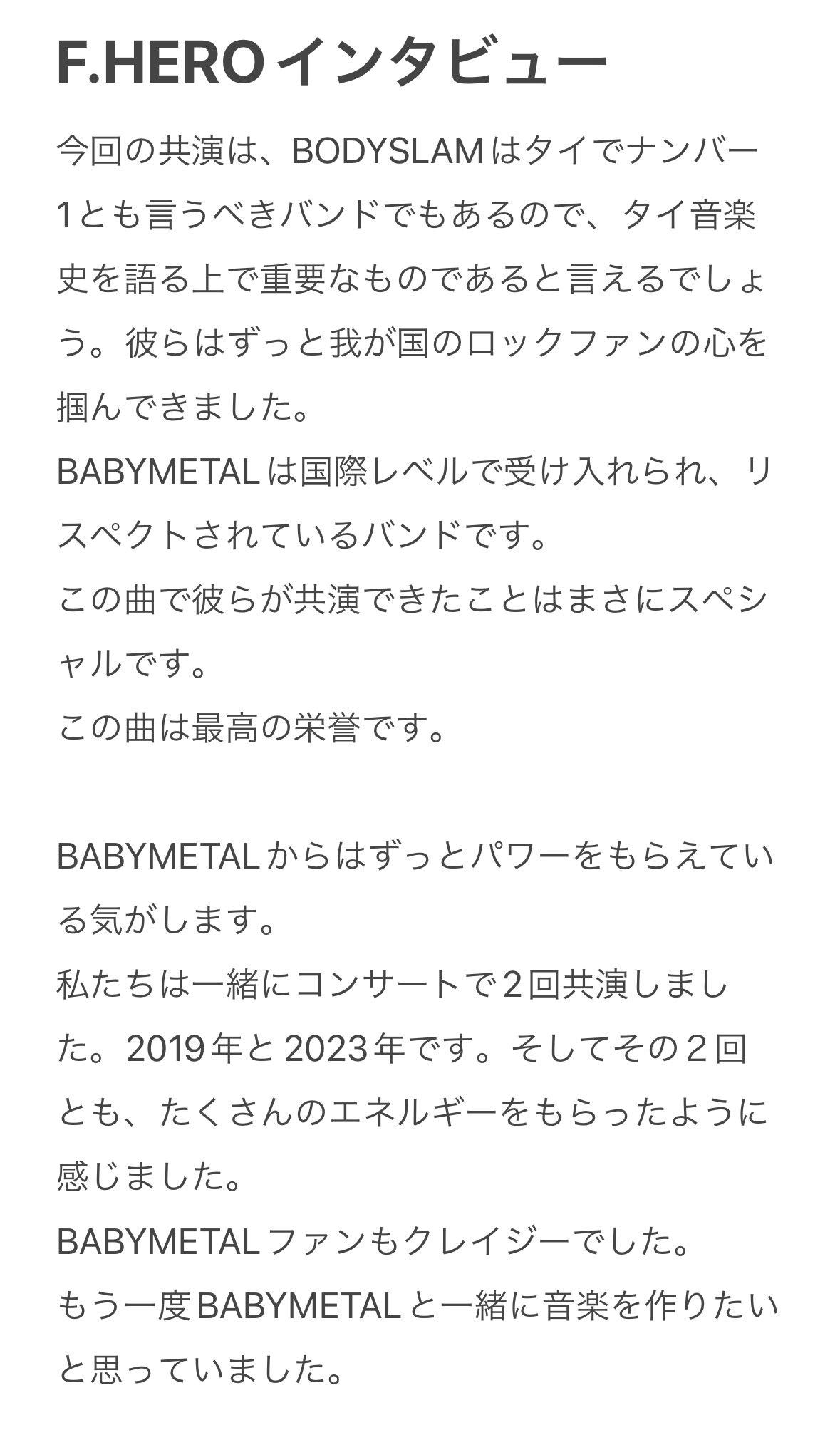 大まかな翻訳。ボディスラムはNo.1ロックバンドとして認められています。前回のBABYMETALとのコラボレーションでもありましたが、彼らのパフォーマンスと歌に元気をもらいました。 Bodyslamさんの曲からも元気をもらいました。そこで、Bodyslam とともに BABYMETAL をプロジェクトに招待しました。