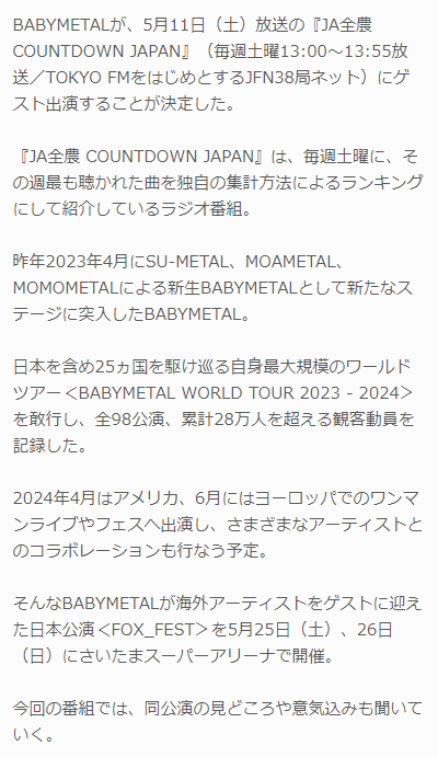 TOKYO FMで毎週土曜日に放送中の『JA全農COUNTDOWN JAPAN』(土曜13:00~13:55放送/TOKYO FMをはじめとするJFN38局ネット)では、5月11日(土)のゲストにBABYMETALを迎えます。