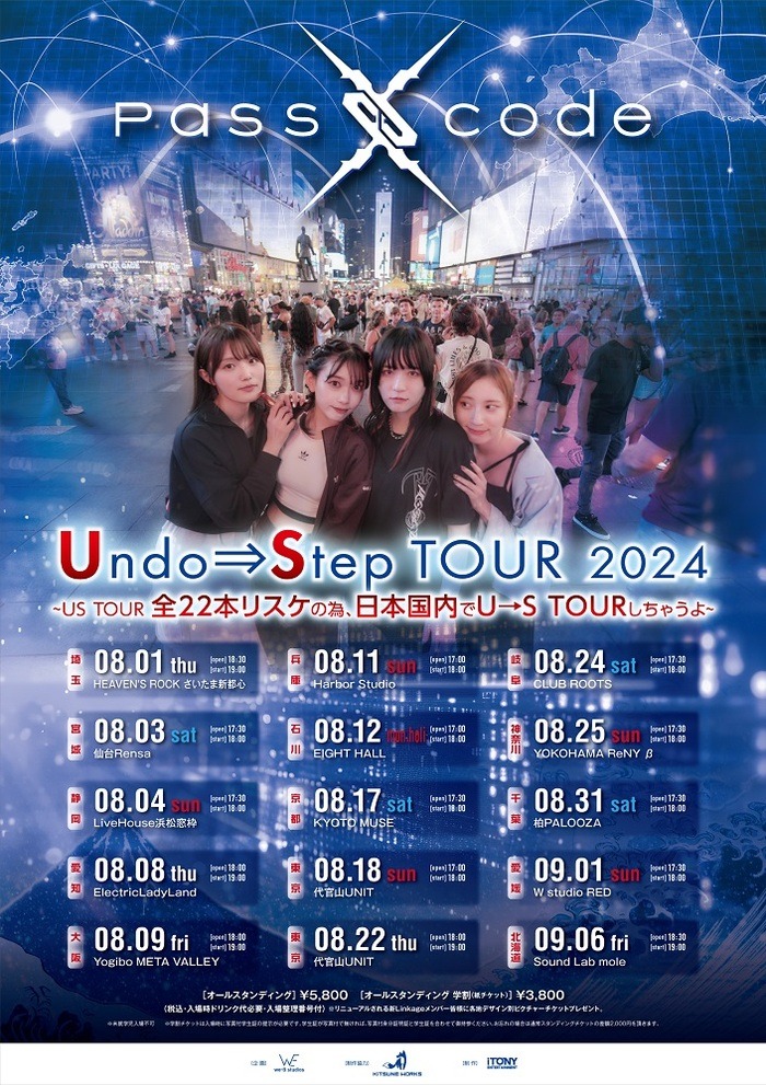 https://news.yahoo.co.jp/articles/88327b348b52c234841c1cc37c1d23b3bfd98cb6PassCodeが8月から9月にかけて開催を予定していた全米ツアーがキャンセルになり、代わりに日本国内ツアー「PassCode Undo→Step TOUR 2024」が行われることが発表された。急遽開催が決まった「PassCode Undo→Step TOUR 2024」は、8月1日の埼玉・HEAVEN’S ROCK さいたま新都心 VJ-3から9月6日の北海道・Sound Lab moleまで全15公演を予定。イープラスでは6月16日23:59までチケットの1次先行抽選予約を受け付けている。PassCodeは昨年9月にグループとして初めてのアメリカツアーを開催。この夏には公演数を増やし、再びアメリカの各地を巡る予定だった。なおメンバーの南菜生は「アメリカツアーの準備をしていましたが、諸事情でキャンセルとなりました」と英語でコメント。2025年にアメリカツアーを実施できるように調整することを伝えている。