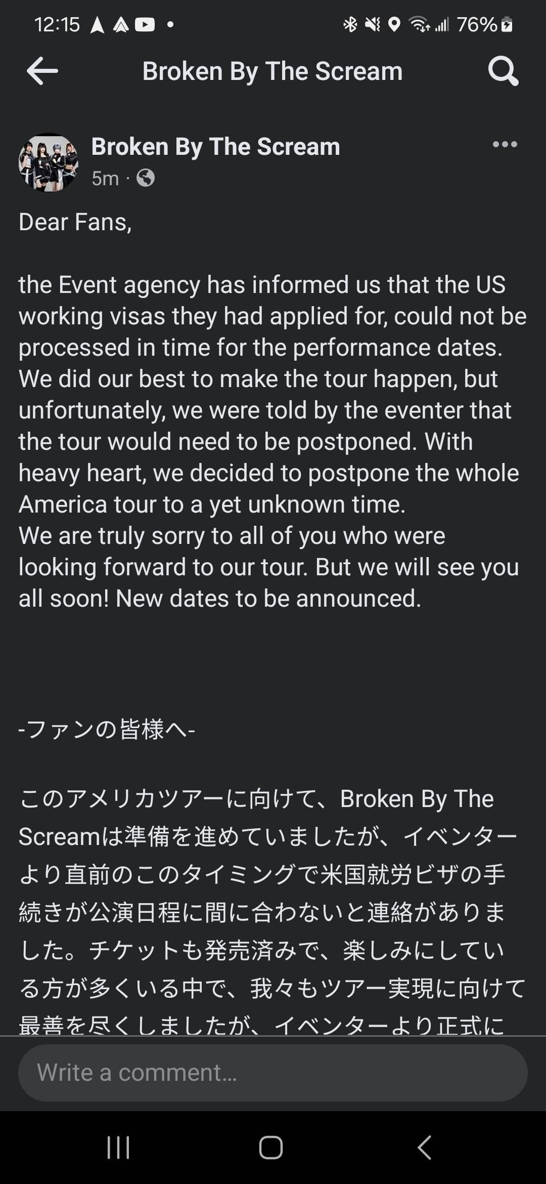 このアメリカツアーに向けて、Broken By The Screamは準備を進めていましたが、イベンターより直前のこのタイミングで米国就労ビザの手続きが公演日程に間に合わないと連絡がありました。チケットも発売済みで、楽しみにしている方が多くいる中で、我々もツアー実現に向けて最善を尽くしましたが、イベンターより正式にツアー延期が決定されました。今回のツアーを楽しみにしていた皆様には本当に心苦しく感じております。今後、延期日程も協議の上決定する予定です。ご理解のほどよろしくお願いいたします。