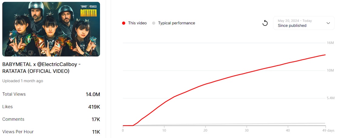RATATATAが、わずか1ヶ月半で、最も視聴されたベビーメタルビデオのトップ10に入るのに、約200万回の視聴しか必要としないというのは、まったく驚くべきことです(10位は、現在1600万回を少し超える視聴回数のThe Oneです)。今年中にトップ5に近づくかもしれません。5番目に視聴されたビデオは、現在3500万回の視聴回数のRoad of Resistanceです。