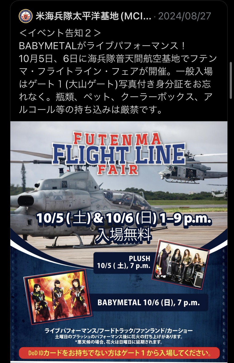 FUTENMA FLIGHT LINE FAIRは、音楽フェスなんかとは性格が全く異なるから、ベビメタの公式が発表や告知なんかしないと思うよ。