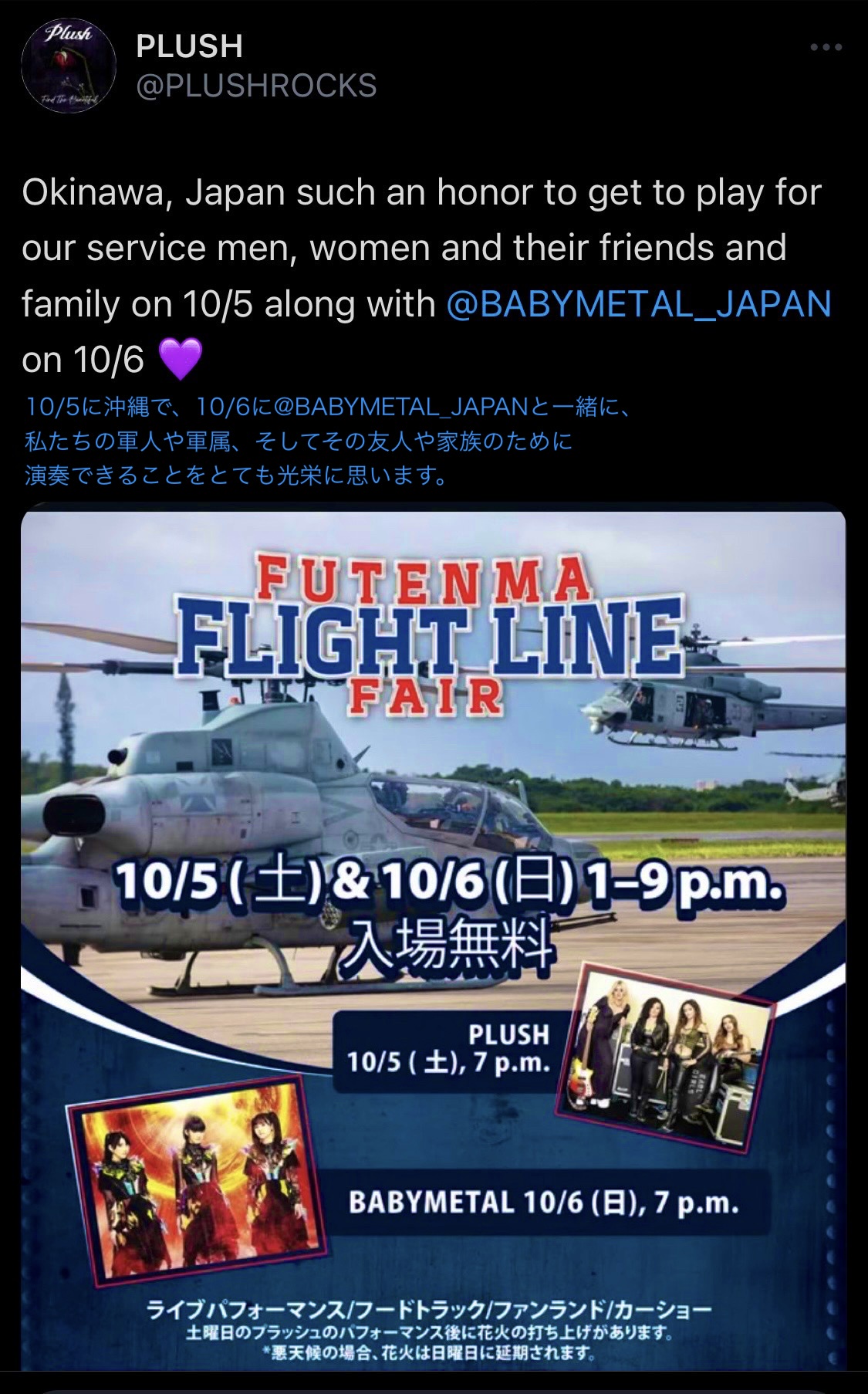 Okinawa, Japan such an honor to get to play for our service men, women and their friends and family on 10/5 along with @BABYMETAL_JAPAN on 10/6 💜 pic.twitter.com/W6hx1tG2co