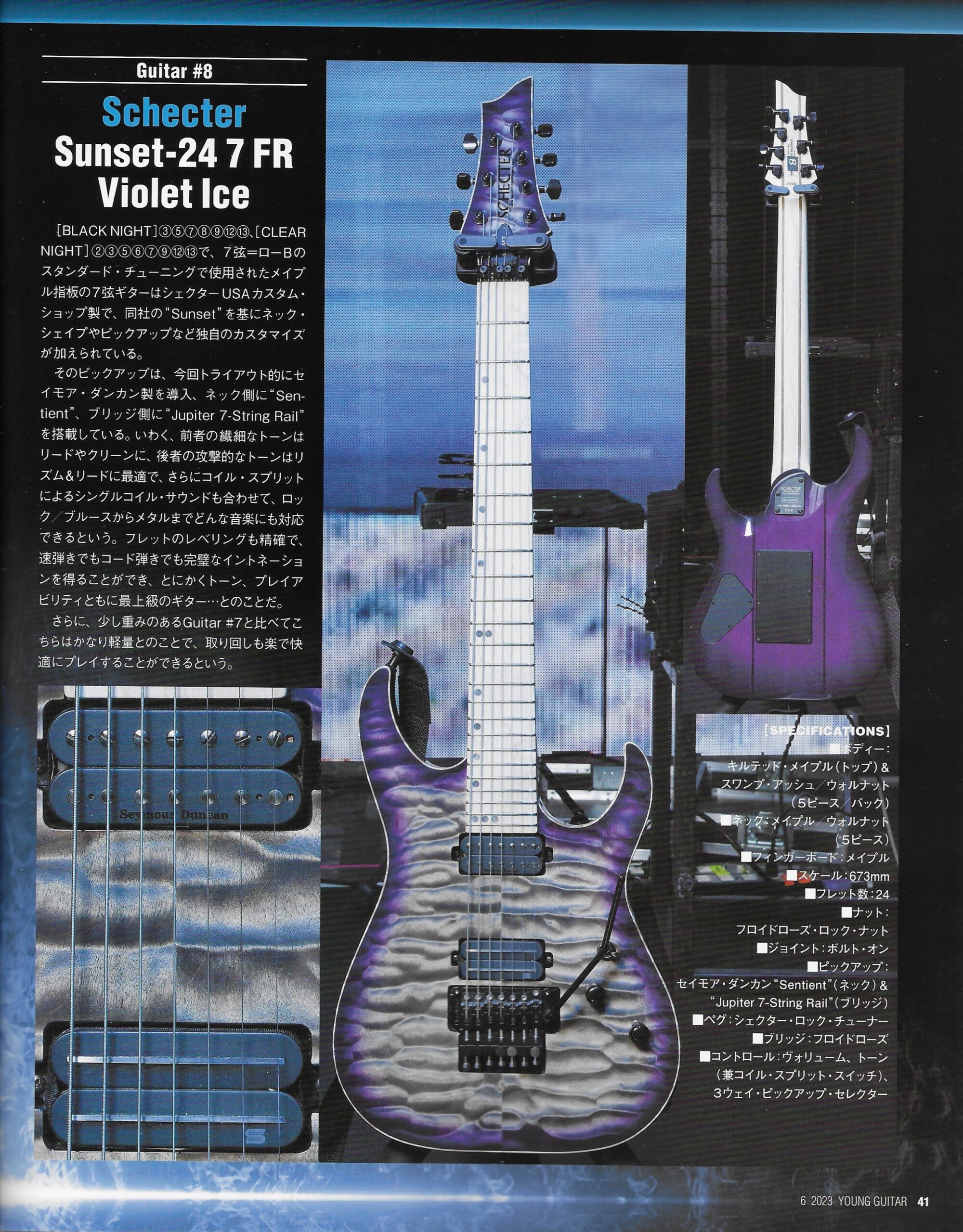 CJはバイオレット アイス カラーの Schecter Sunset-24 7 FR を使用しています。