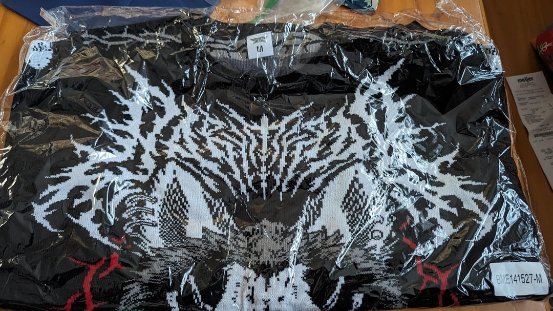 あなたが手に入れたセーターは、公式ツイートに載っている、文字が左右対称になっているセーターと一致していますが、米国のショップに添付されている別のデザインも見受けられます。とても奇妙です。