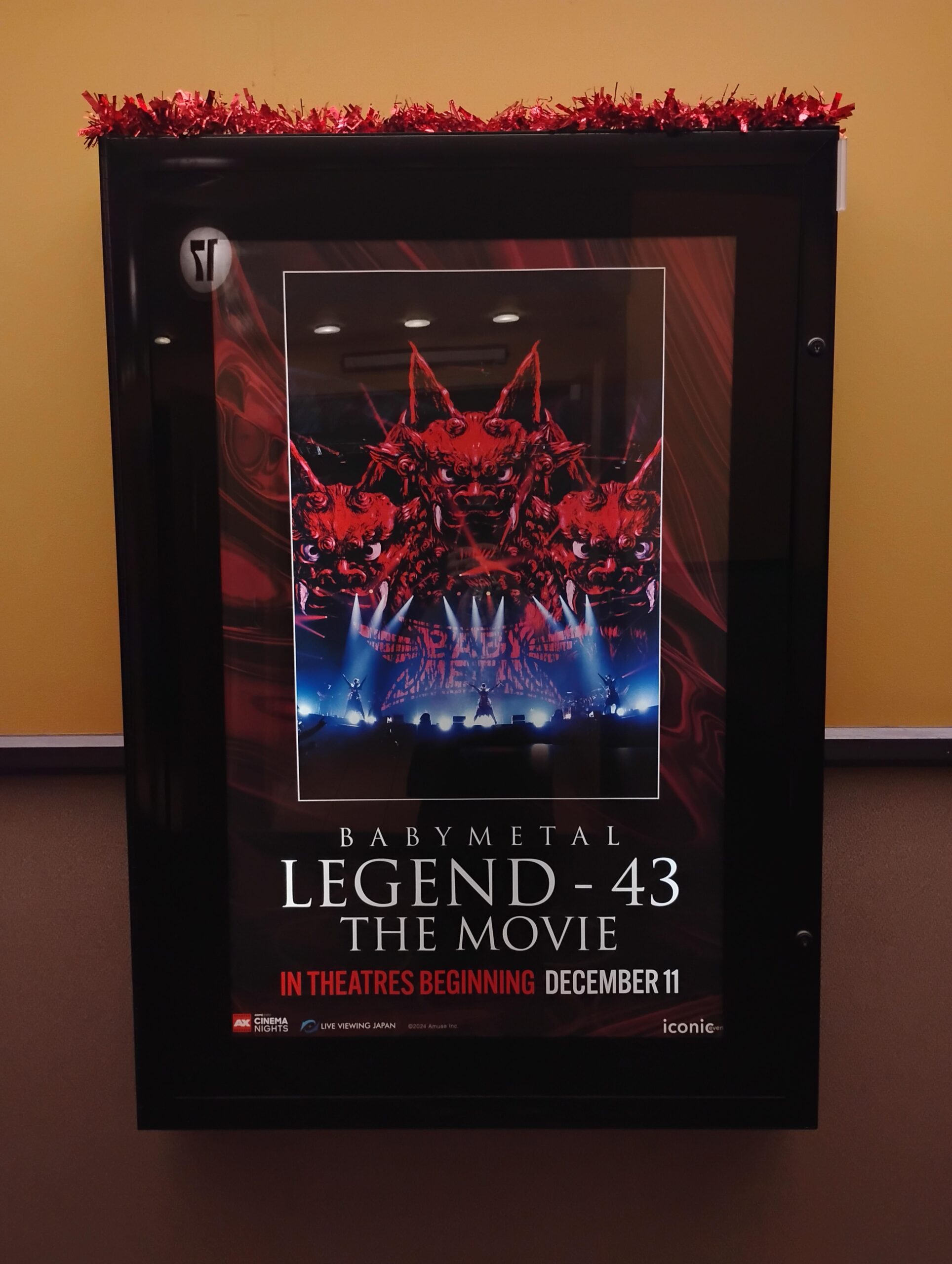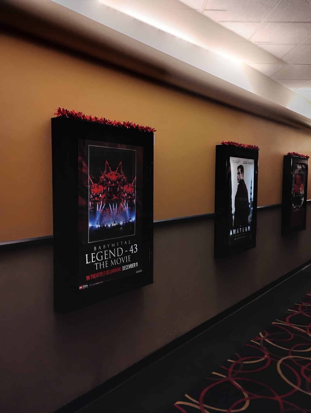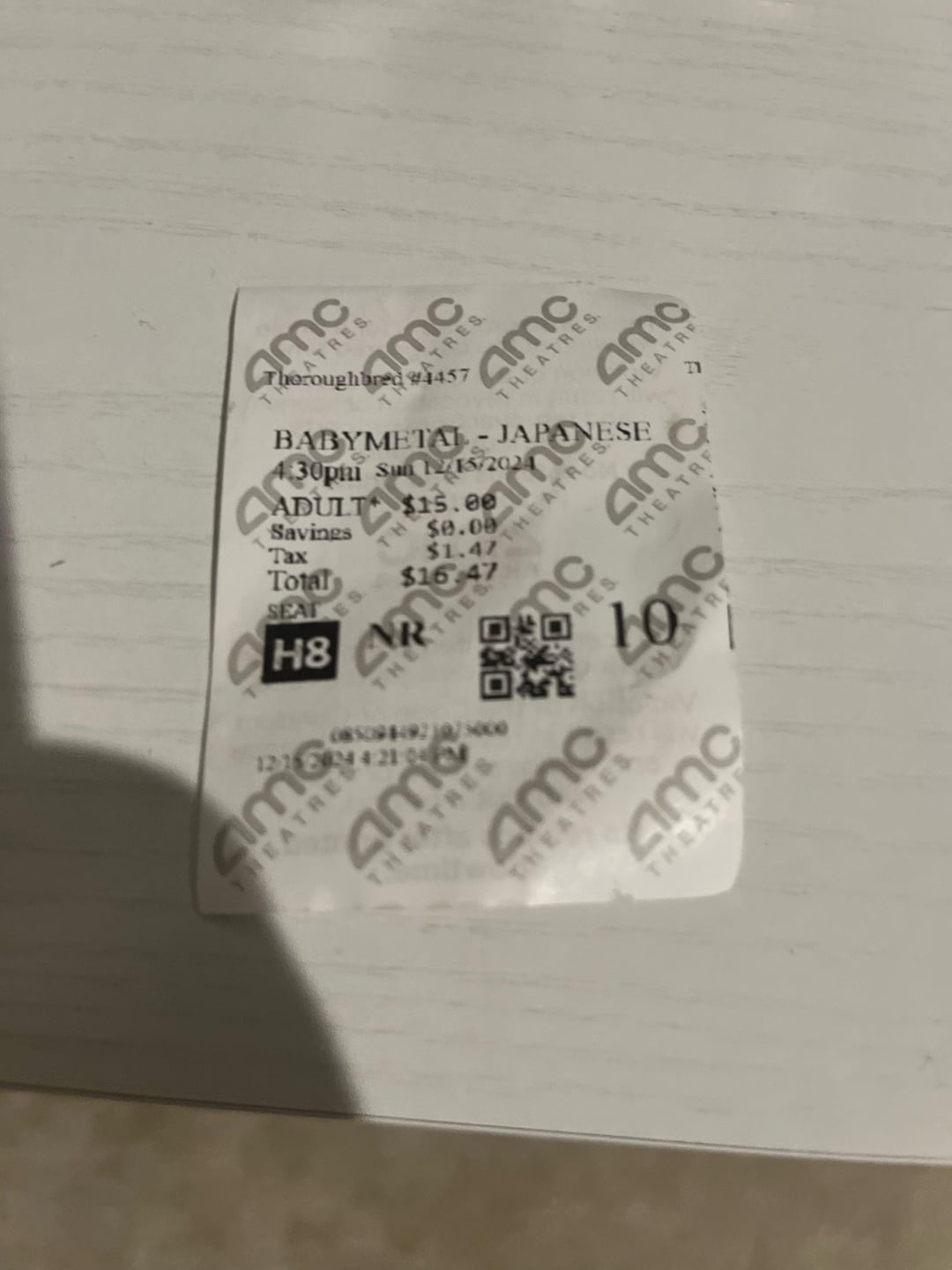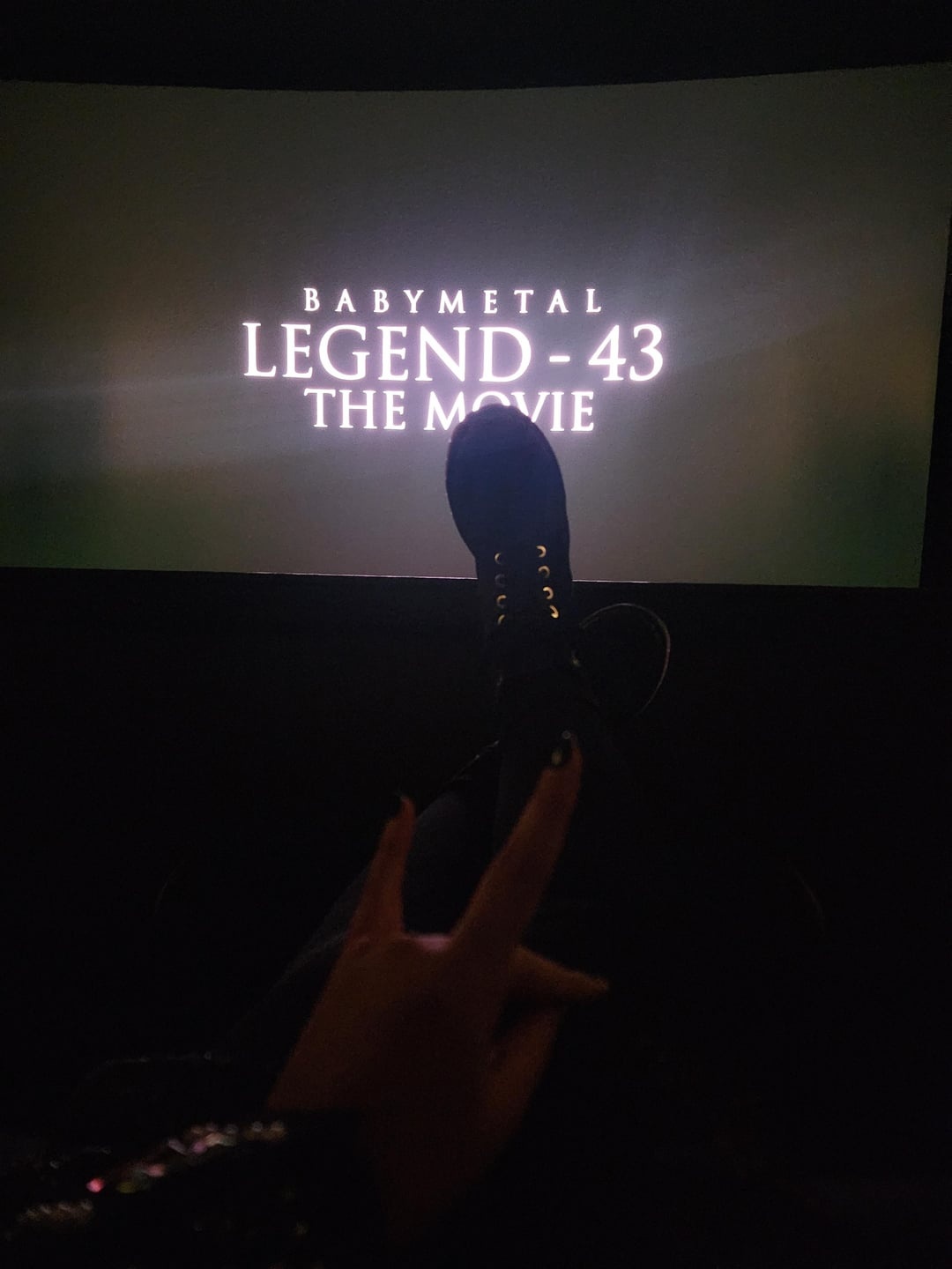 劇場を独り占めできると思っていたけど、数人が遅れて来た!映画は最高だった。コメントを見て編集が心配だったけど、素晴らしかった。BABYMETALのショーが全部こんな風に編集されるのは嫌だけど、劇場の設定では完璧に機能していた。クールな瞬間がたくさんあった。神バンドのショットもたくさんあってよかった。白黒のモノクロ。Brand New Dayで太陽の前にどこからともなく現れる女の子たち。RoRでSuとMoaがMomoにぶつかる、笑。