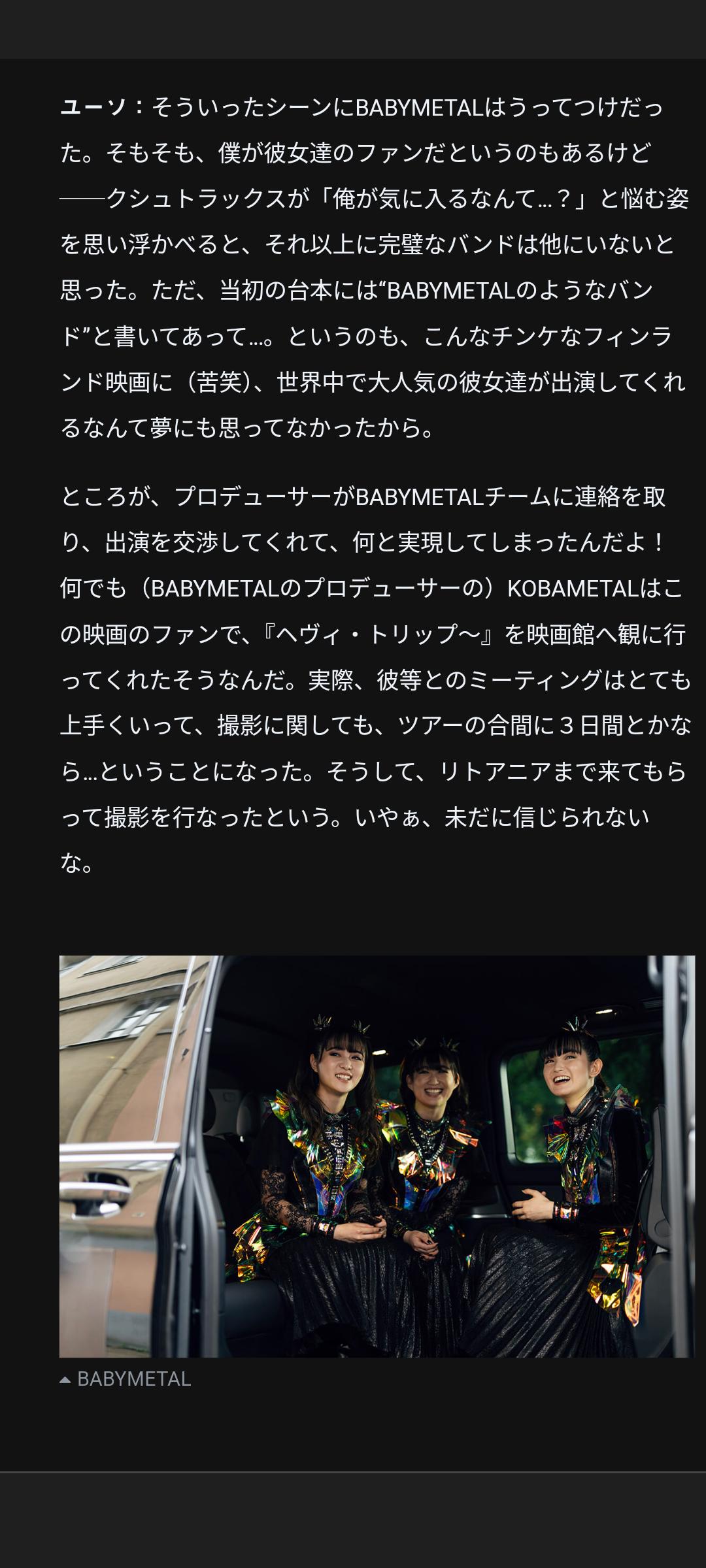 フィンランドの監督からこんなちっぽけな映画に世界的バンドのBABYMETALが出てくれるなんて夢にも思わなかったとか言われるなんてベビメタ本当にワールドワイドなスターなんだね