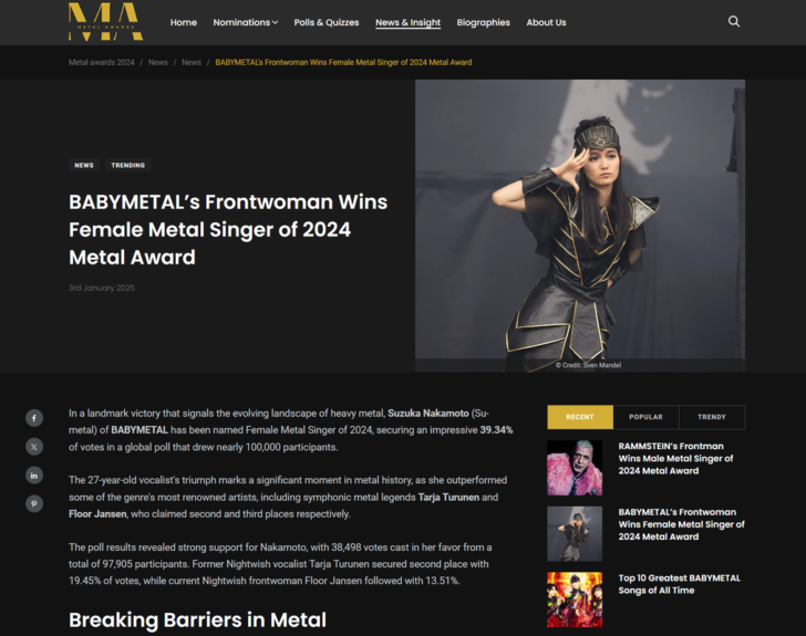 ヘビーメタルの進化を示す画期的な勝利として、BABYMETALの中元すず香(Su-metal)が、約10万人が参加した世界的な投票で39.34%という素晴らしい得票率を獲得し、2024年の女性メタル・シンガーに選ばれた。