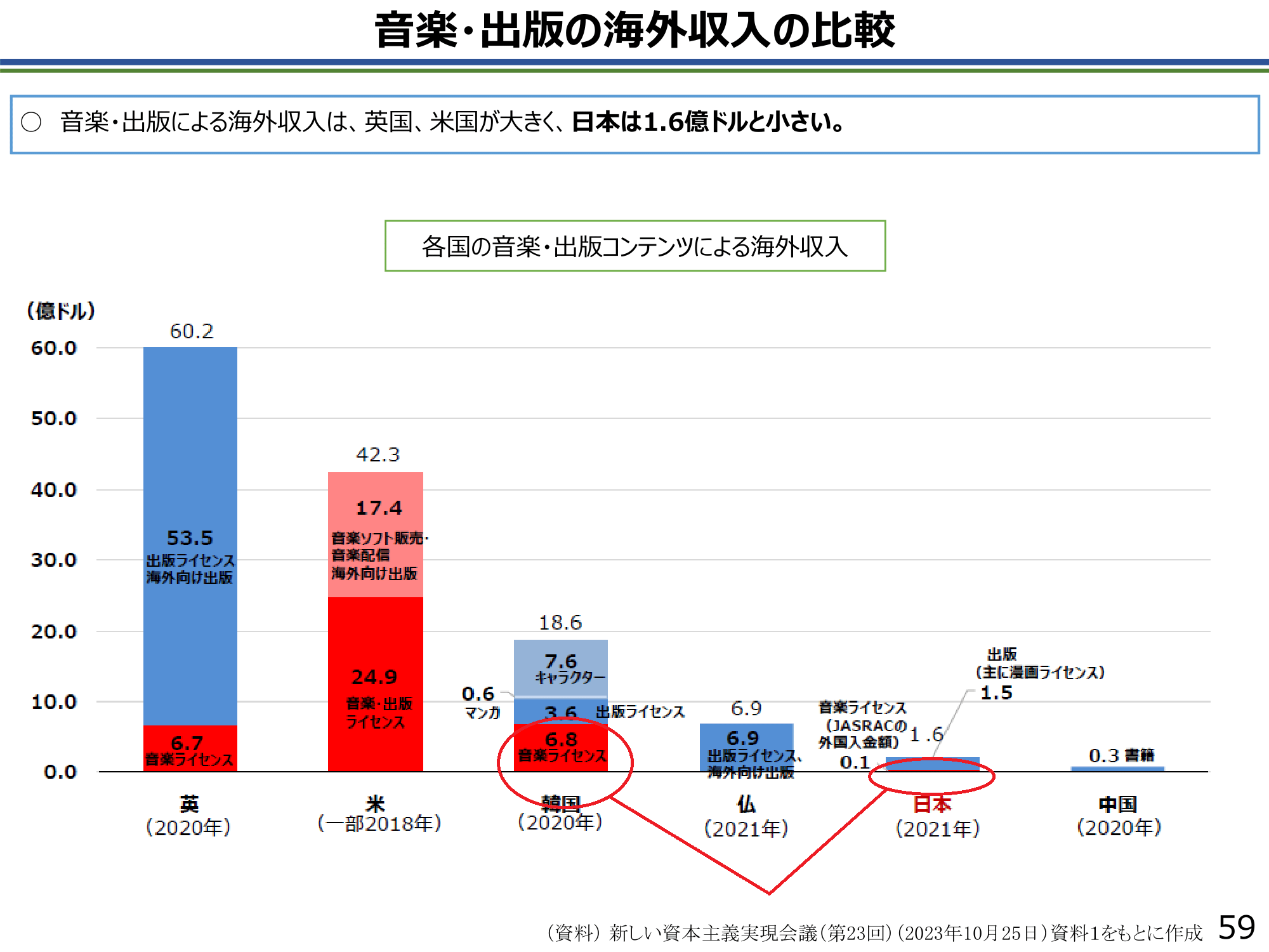 下の日本政府報告書の画像を見ると、韓国の海外音楽ライセンス収入は2020年に6億8000万ドルだったことがわかる。一方、日本の収入はわずか1000万ドル(2021年)で、大きな差がある(赤で囲んだ部分)。