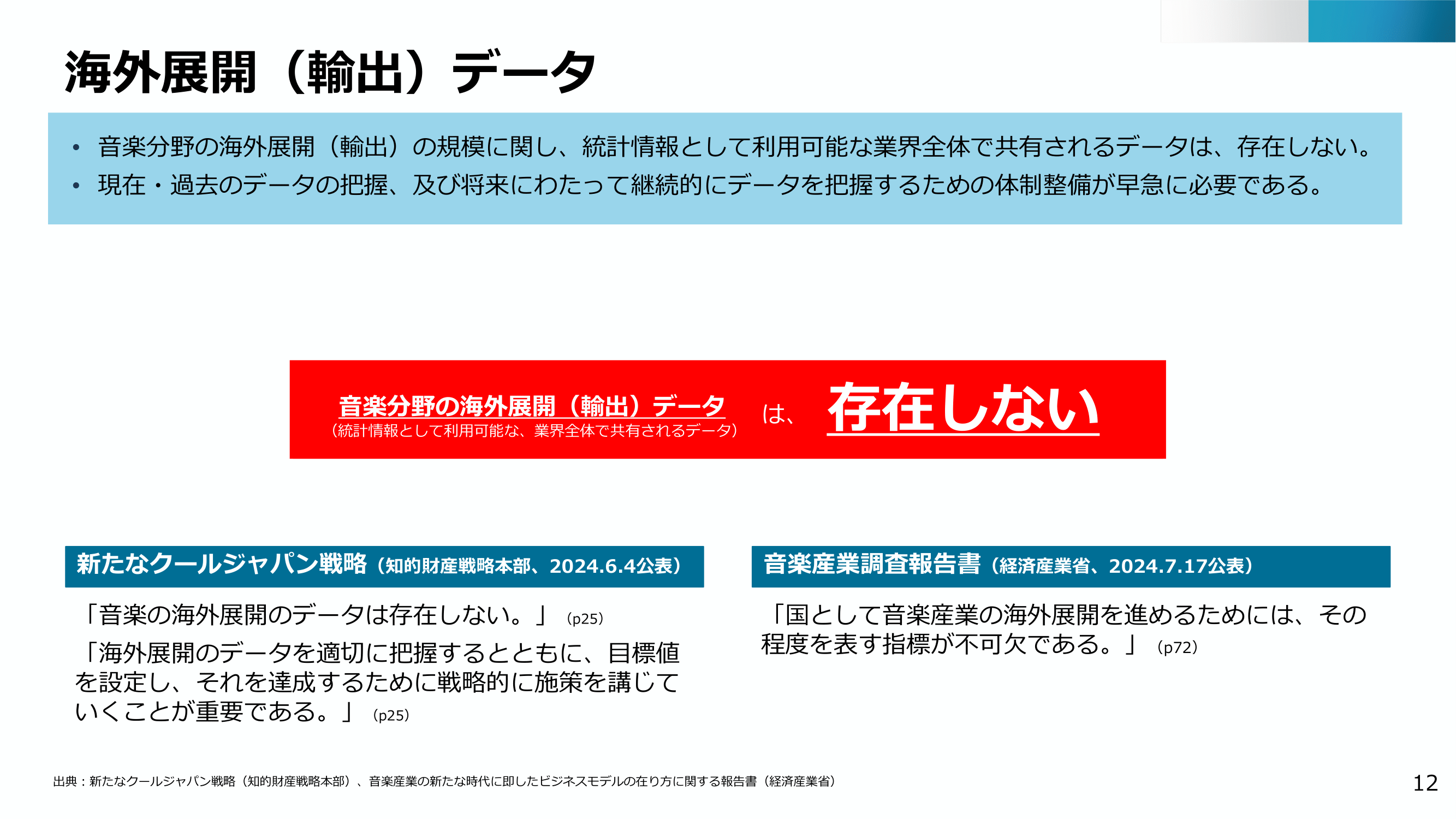 上記はライセンスに特に焦点を当てていますが、METI(経済産業省)の2024年の報告書では、日本のより大きな課題が強調されています。それは、海外への音楽輸出全体を業界全体で計算する方法が欠如しており、リソースを最大限に活用する方法がわからないため、拡大が非常に困難になっていることです。