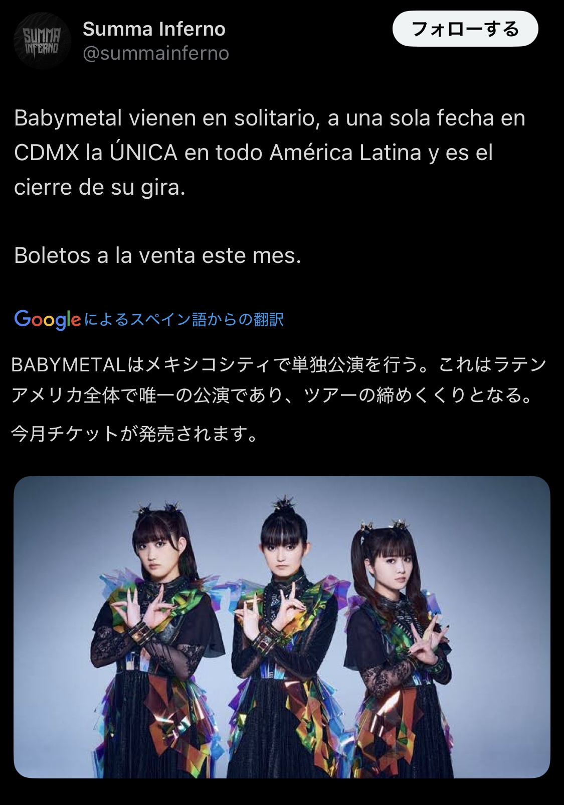 去年ノットフェスメキシコでプロモーターがインスタでベビメタに感謝してたもんな