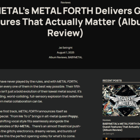 こうした親しみやすさは、アルバムの魅力を損なうものではない。『Metal Forth』は驚異的で、2016年にスティーヴン・コルベアを困惑させたJ-POPアイドルのギミックから、世界中の戦闘ベストにロゴが縫い付けられるほどの本格的なメタルバンドへと成長したBABYMETALの軌跡を象徴している。