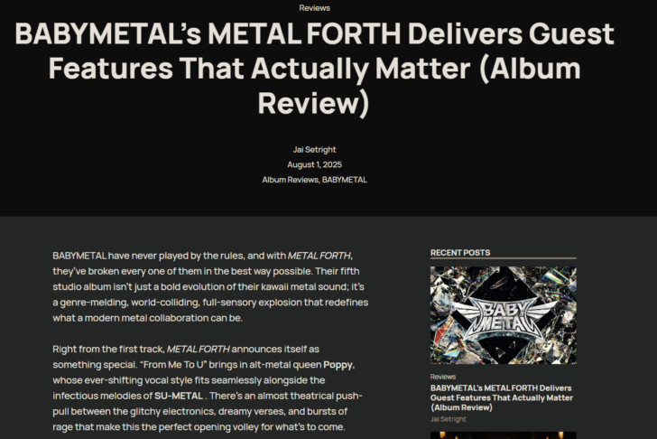 これはただのメタルアルバムではない。ルールブックを手放し、ただ創造することで何が起こるかを、ジャンルを飛び越えて祝福する作品だ。BABYMETALはこれまでも限界に挑戦してきたが、METAL FORTHは彼らがその限界を破壊した初めての作品かもしれない。デスコアの熱狂的ファン、メタルコア純粋主義者、プログレオタク、あるいは単にブラストビートのキャッチーなサウンドが好きな人など、誰にとっても何かがあるはずだ。