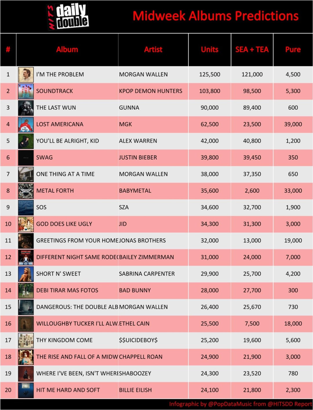 これは非公式の週半ばのアップデートです。Billboard 200の追跡週は金曜日から木曜日までです。その後、日曜日にトップ10の記事を掲載し、翌週火曜日にチャート全体を更新します。