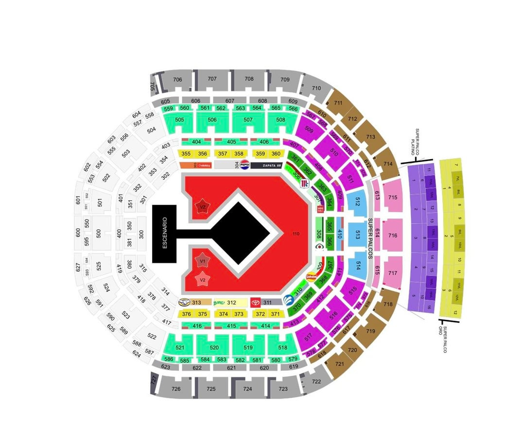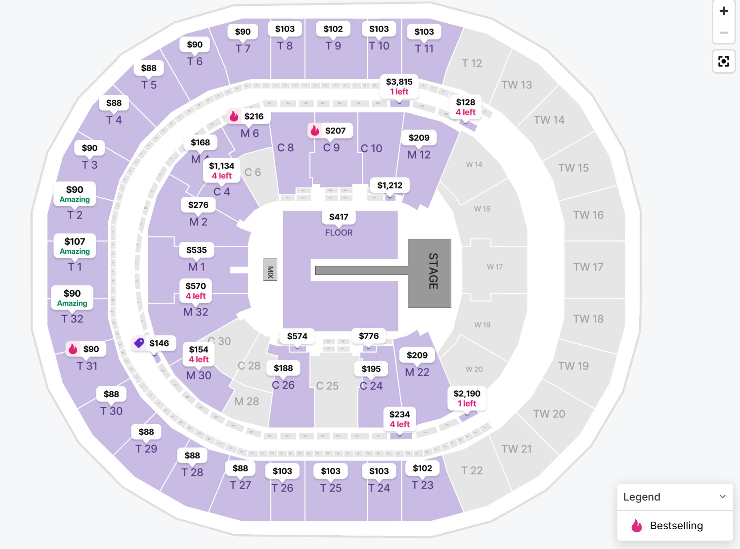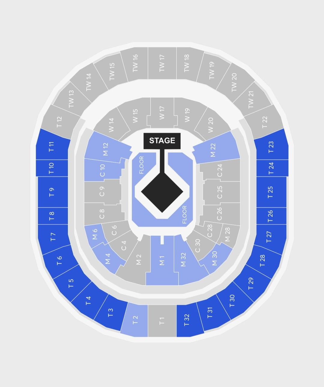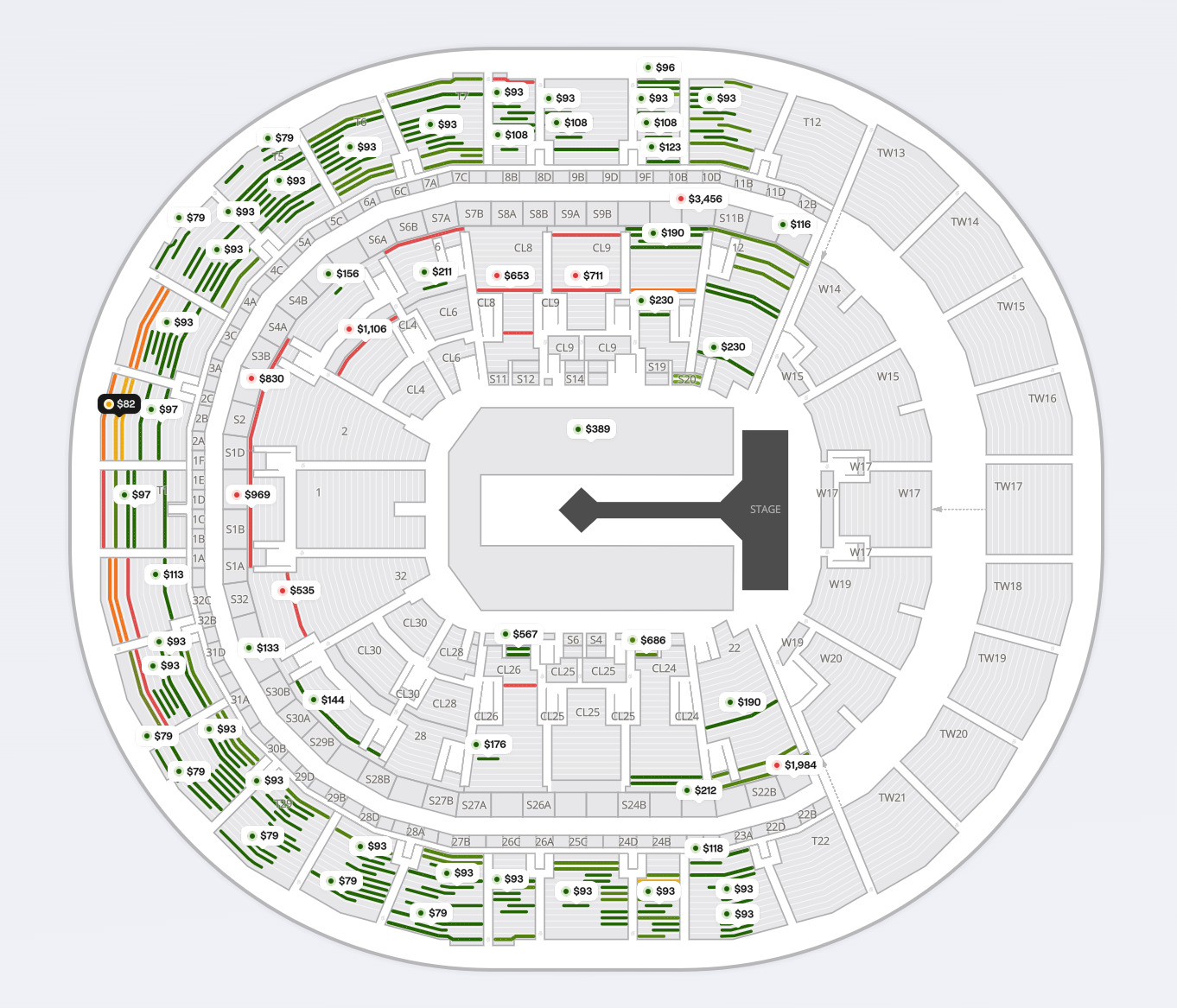 大体、大まかな寸法は正確です(例えば、エンドステージかセンターステージかなど)。しかし、正確な寸法はほぼ当てになりません。また、チケット販売サイトによって表示が異なる場合も少なくありません。例えば、SeatGeekとStubHubの現在の座席表はこちらです。
