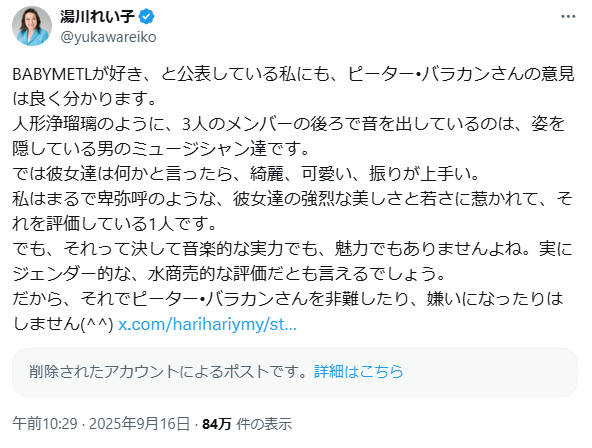 湯川れい子、人気音楽ユニット「BABYMETAL」を「水商売的」と発言して大炎上…「人間性さえも疑う」ファン大憤慨9月16日、大ベテランの音楽評論家・湯川れい子(89)が自身のXで世界的に人気の音楽ユニット「BABYMETAL」(以下、ベビメタ)についてポストした内容が物議を醸している。発端は、同じく音楽評論家のピーター・バラカン氏が2016年頃にベビメタについて《あんなまがい物によって日本が評価されるなら世も末だと思います》