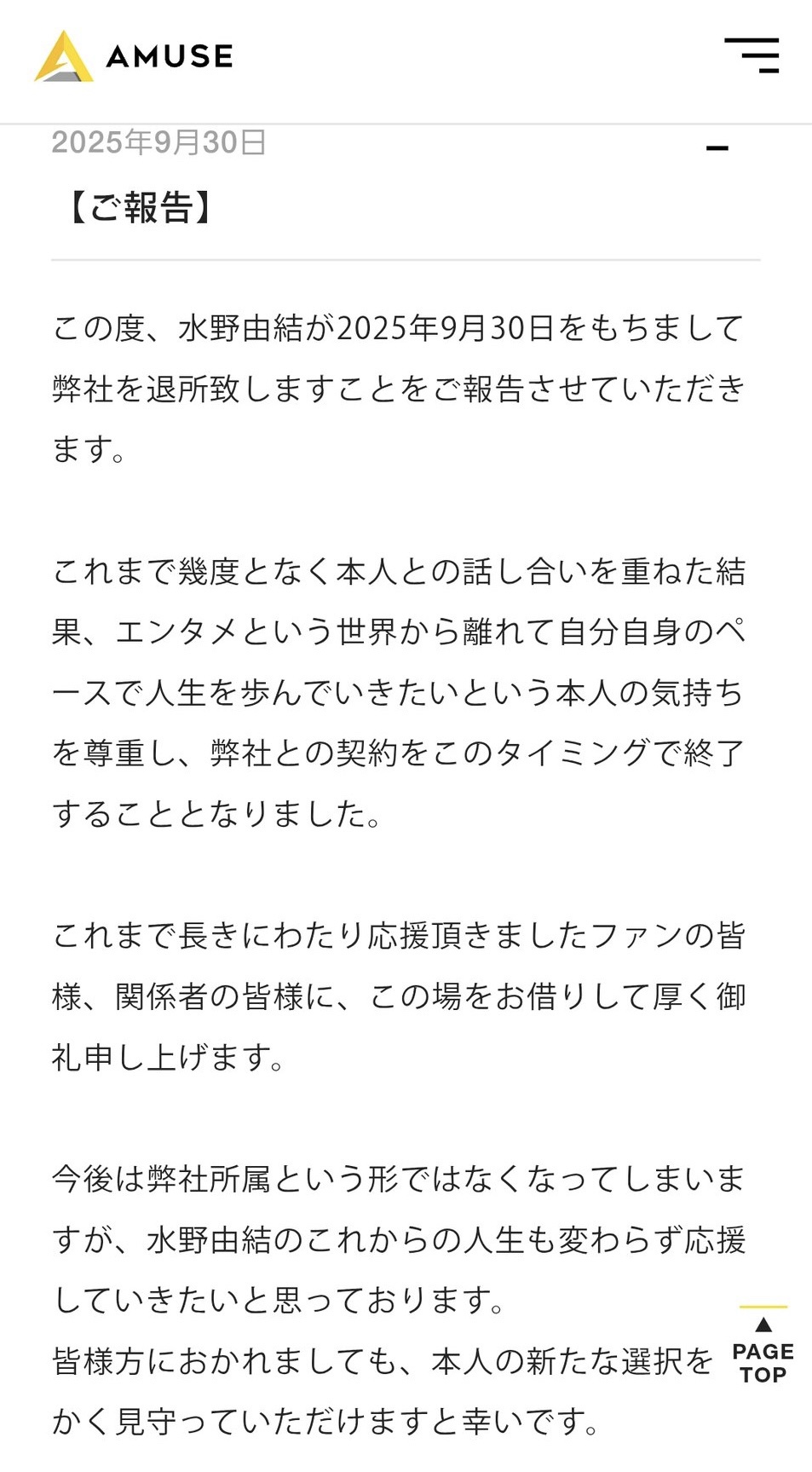 水野由結ついにアミューズ退所